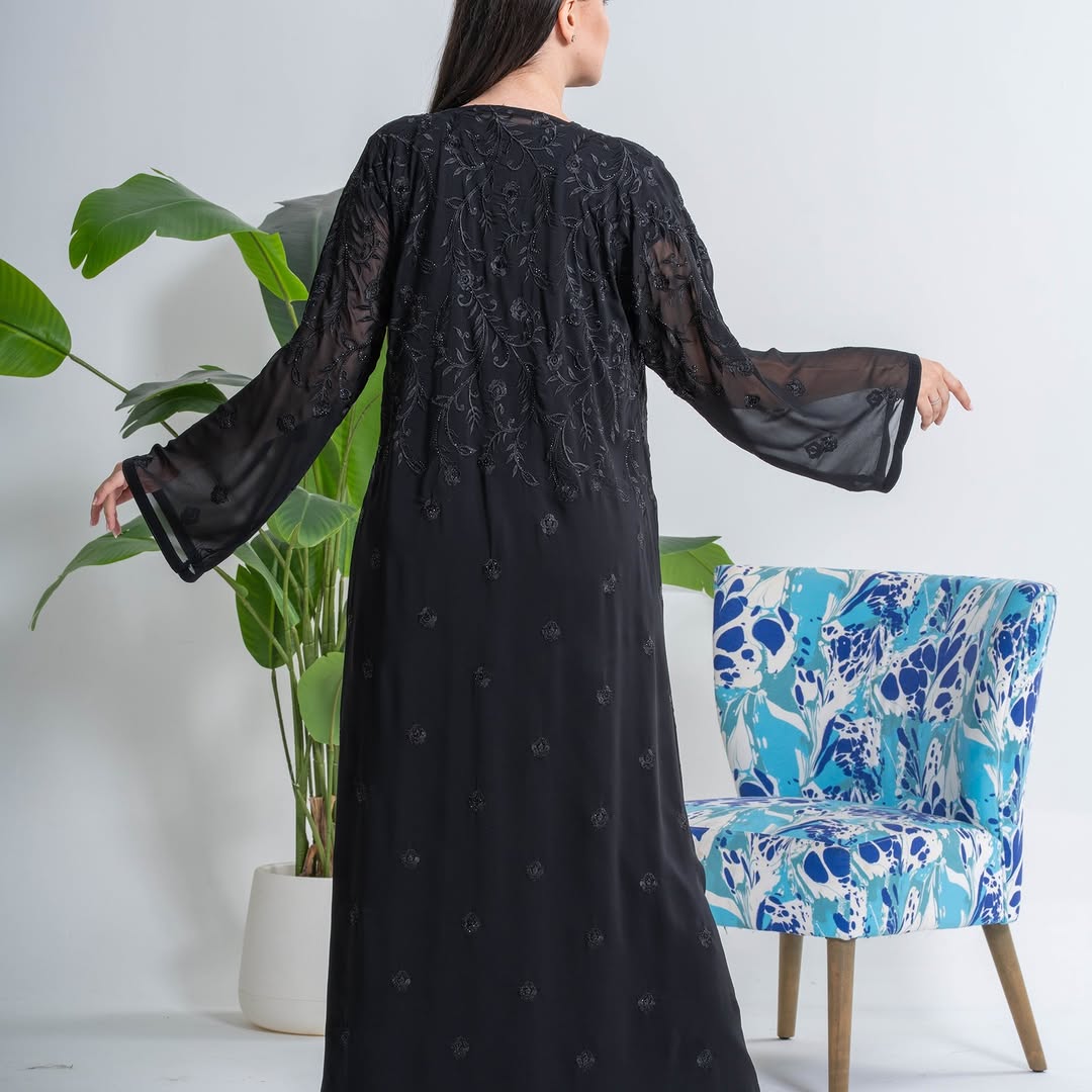 This beautiful black abaya is crafted with exquisite heavy embroidery, creating a luxurious and elegant look perfect for parties and special occasions. Made from premium chiffon fabric, it offers a soft, lightweight feel with a graceful flow that enhances movement. The detailed embroidery adds richness and sophistication, while the classic black color ensures timeless appeal. Designed to combine comfort with style, this abaya is ideal for evening gatherings, celebrations, and formal events. Pair it with minimal accessories to let the intricate craftsmanship shine and make a lasting impression with refined modest fashion.